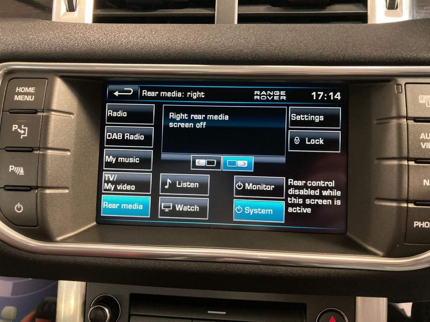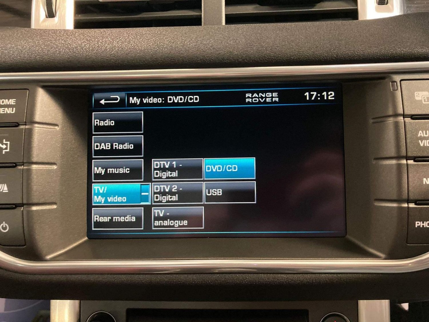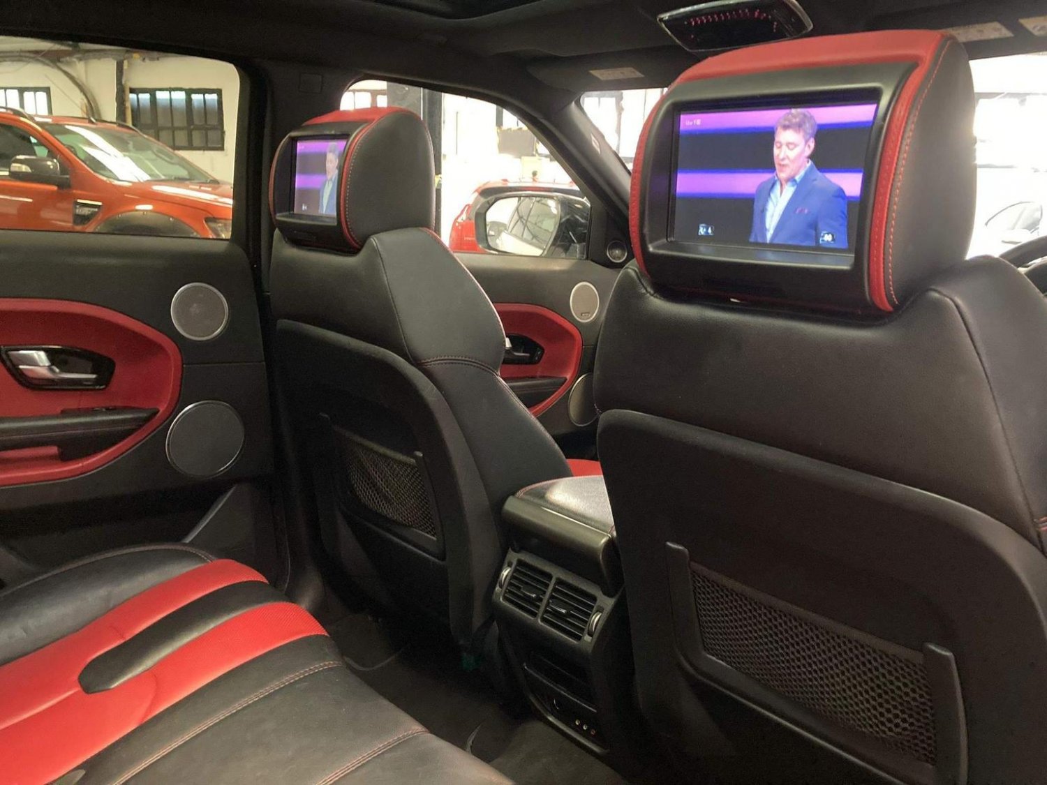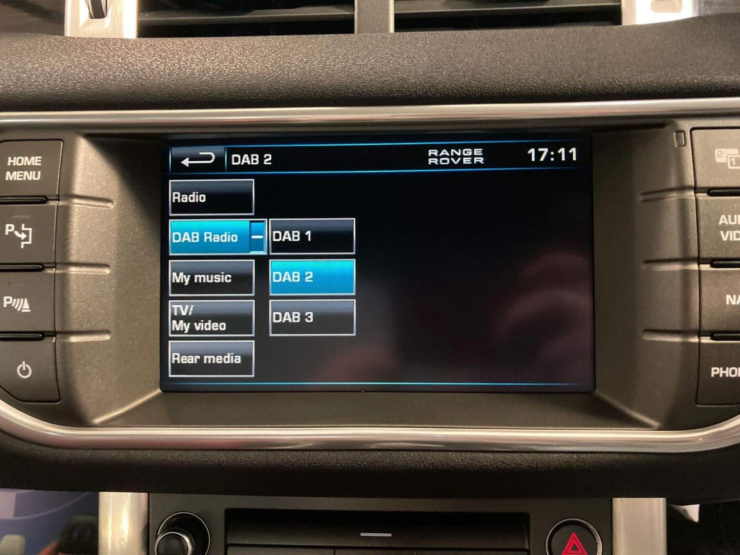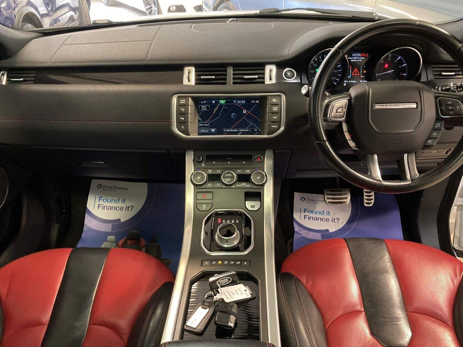 10 Speakers, 20in Alloy Sport Style 6 - Sparkle Silver, 3.5mm Stereo Auxiliary Input Socket, 380W Meridian Surround Sound System, 5in TFT Driver Information Centre, 8in High Resolution Touch Screen, ABS - Anti Lock Braking System, Adaptive Dynamics, Airbags - Driver Knee, Airbags - Full Size Driver, Airbags - Full Size Passenger, Airbags - full length curtain, Alarm System - Volumetric, Aluminium Pedal Finisher Kit, Armrest - Rear Centre with Storage Compartment and 2 Cupholders, Audible Seat Belt Warning, Audio Connectivity System, Audio System - 380 Watt Meridian Sound System with Radio and Single Slot CD, Audio System - DAB, Automatic Headlight Levelling, Automatic Headlights, Auxiliary Heater - Electrical Positive Temperature Coefficient, Auxillary Power Sockets - Rear and Load Space, Auxillary Power Sockets - front-rear and load space, Bluetooth Telephone Connectivity, Carpet Mats with Edging, Centre console - Covered Storage Compartment, Climate Control - Automatic with Air Filtration, Cornering Lights, Cruise Control, Cupholders x2, DSC - Dynamic Stability Control, Door Mirrors - Electrically Adjustable - Heated and Power Folding with Memory Function, Dynamic Exhaust, Dynamic Front Bumper, Dynamic Perforated Leather Steering Wheel, Dynamic Rear Bumper, Dynamic Side Sills, Dynamic grille in Narvik Black, EBA - Emergency Brake Assist, EBD - Electronic Brake-Force Distribution, EDC - Engine Drag Torque Control, EPAS - Electronic Power Assisted Steering, EPB - Electronic Park Brake, Electric drivers and passenger seat adjustment, Evoque Badge in Red, Exterior Mirrors - Auto Dipping in Reverse Gear, Exterior mirror caps in Narvik black, Four electric windows with one touch opening, Front Fog Lights, Global opening for windows - windows open via remote key, HDC - Hill Descent Control, HDD Premium Navigation with Touch Screen, HSA - Hill Start Assist, Hazard Warning Lights Under Heavy Braking, Headlight Power Wash, Heated Front Seats, ISOFIX Child Seat Anchor Points, Illuminated tread plates, Illumination - Footwell, Illumination - Front Header Cour with delay Theatre dimming + Maplights, Illumination - Glovebox, Illumination - Load Compartment Light, Illumination - White Lighting in door release and over head console downlighter, Interior Mood Lighting, Land Rover - Tyre Repair System, Leather Gear Knob, Light Pipe with Controllable Colour and Intensity x2 - LED, Locking Wheel Nuts, Luggage Compartment - Anchor Points, Luggage Cover, Lumbar Support, MP3 disc and file compatibility, Memory and electric passengers recline, Parking Aid - Front, Parking Aid - Rear, Parking Aid - Rear View Camera, Proximity Sensing and Touch Detection For Overhead Map Lights, Push Button Start, RSC - Roll Stability Control, Rain Sensing Windscreen Wipers, Range Rover Smart Key Controls - Remote lock-Unlock-Double Lock-Lights on Tailgate Open, Rear spoiler, Remote Central Locking, Seats - 60/40 Split, Seats - Rear Centre Head Restraint, Side Fender Blade Grille and Tailgate Finisher in Narvik black, Side sill mouldings, Steering Column - Manual For Height and Reach Adjustment, Steering Wheel Mounted Audio Controls, Subwoofer, Sun Visors - Illuminated Vanity Mirrors, TCS - Traction Control System, TMC - Dynamic route guidance, TSA - Trailer Stability Assist, Terrain Response, Textured aluminium centre console finisher and textured aluminium IP finisher, USB Connectivity, Voice Control - Say What You See, Waist finisher - High Gloss Black, Windows - Heated Rear Windscreen, Windscreen - Heated, Windscreen Washer Jets - Heated, Xenon Headlamps with LED Signature